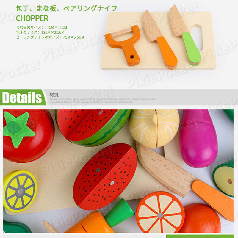 名称:果物・野菜17点セット 対象年齢:3歳以上 主な材質:高品質の木材 ネットウェート:1.2kg スタイル:果物・野菜セット 産地:中国 果物・野菜セット 野菜、果物、まな板、包丁などは野菜や果物に関する知識を教える。