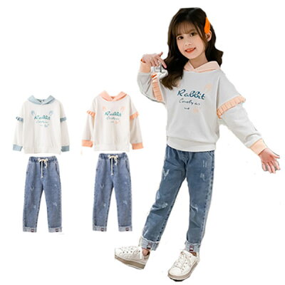 韓国子供服 セットアップ キュート 女の子 上下セット スウェット ジーンズ 長袖 フード付き ウサギ柄 可愛い 大人気 女児用 パンツセット 春秋 新作 ピンク ブルー 通学 遠足 110cm 120cm 130cm 140cm 150cm 160cm