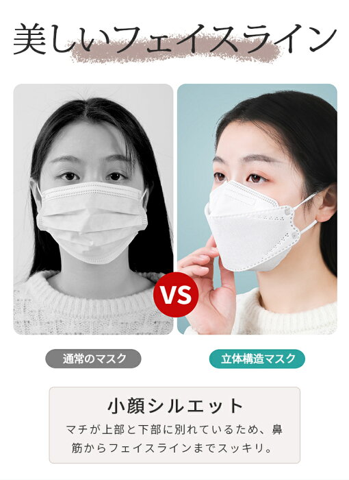 下部のマチで顎を隠すことで、美しいフェイスライン・小顔見せを実現します!【使いやすさのポイント:密着性が高いメガネが曇りにくい】人体工学に基づいた設計により、どんな顔でも密着性を高め、空気が漏れる隙間を無くすとともに、通気性の良い特殊な素材を使用している為、マスクが曇りにくい構造となっております。